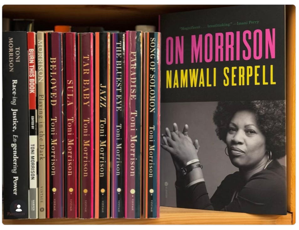 I did a double-take yesterday upon seeing this photo on the Barnes & Noble account, noting that the great Namwali Serpell would be on the Poured Over podcast to speak about her new book, On Morrison. To the left of Serpell’s study are Morrison’s seven novels and two volumes of nonfiction. The second title from the left is something of a rarity—Burn This Book, a collection of essays subtitled PEN Authors Speak Out on the Power of the Word. Harper Studio (now defunct) put it out in 2009. If this image were somehow 3-D, and I could reach in and pull that spine out just enough to read the left-most third of the cover, you’d see a list of 11 authors, each in its own black, white, or gray square. Most are so famous (both circa 2009 and today) they can be identified by last name alone: